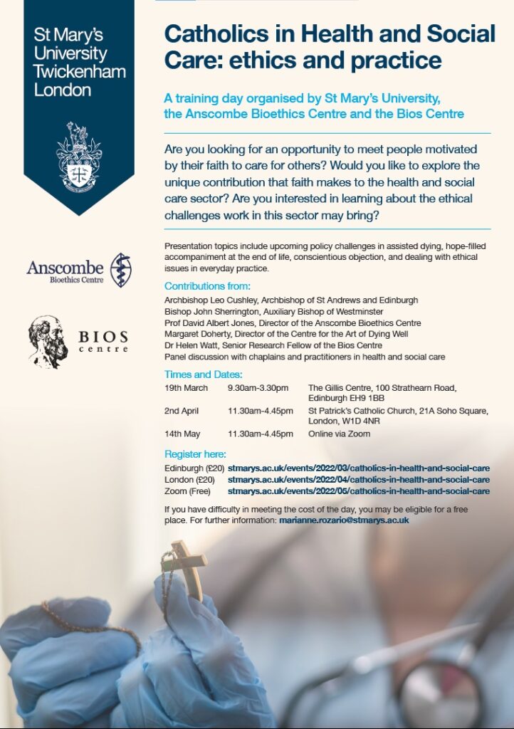 St Mary’s University, the Anscombe Centre and the Bios Centre are holding three events on ethics and practice in health and social care. The events are aimed at Christians working […]
